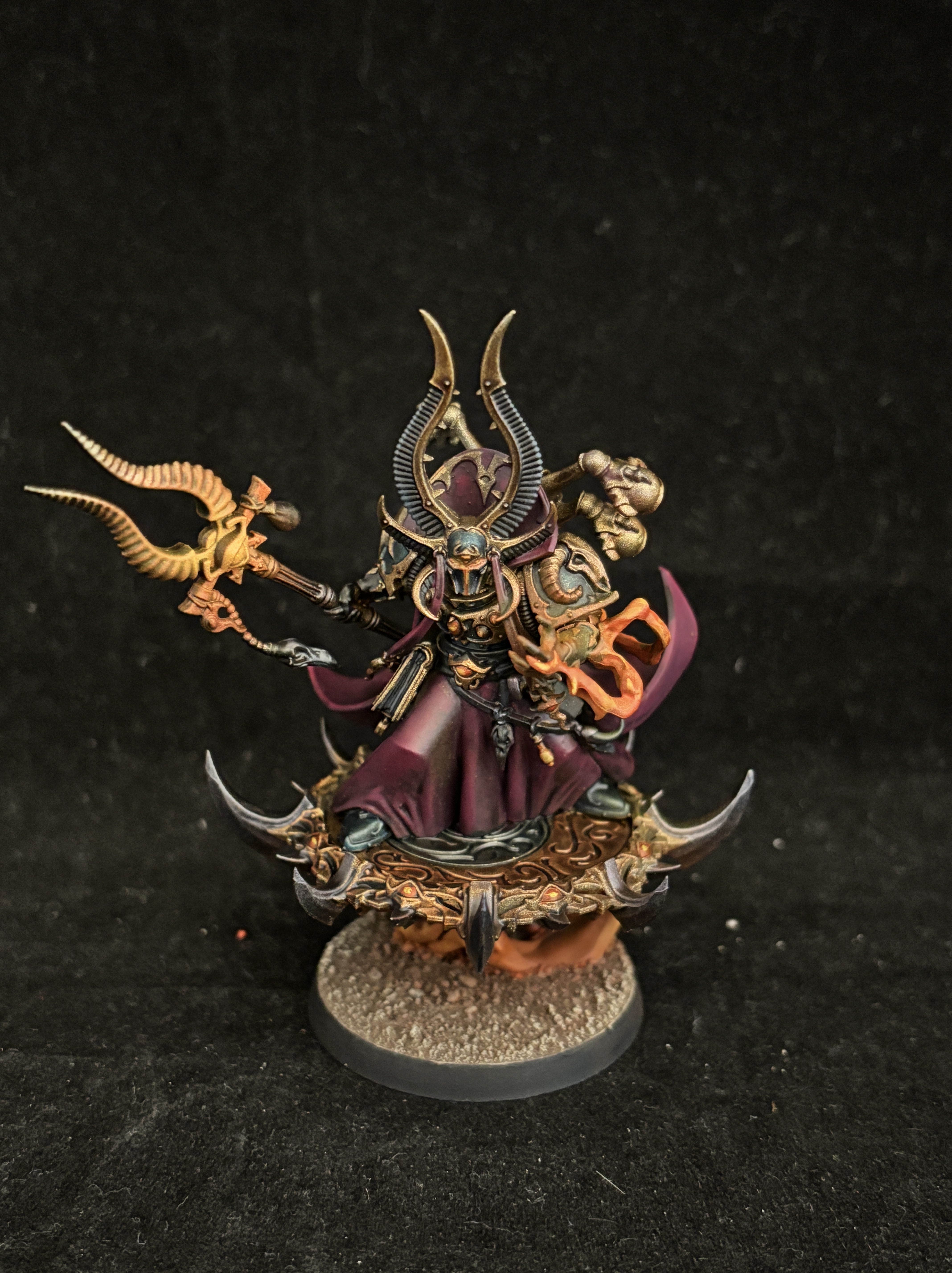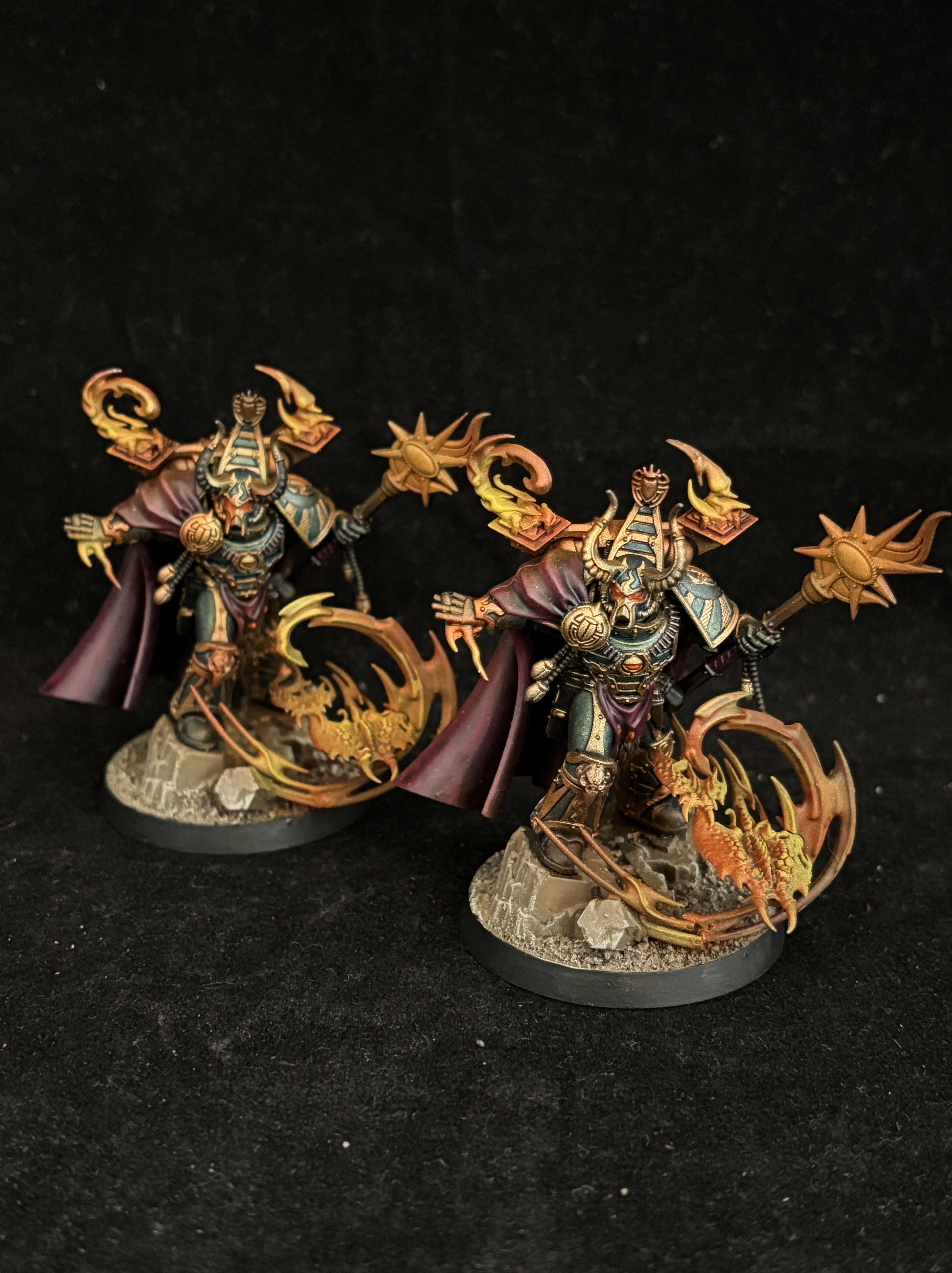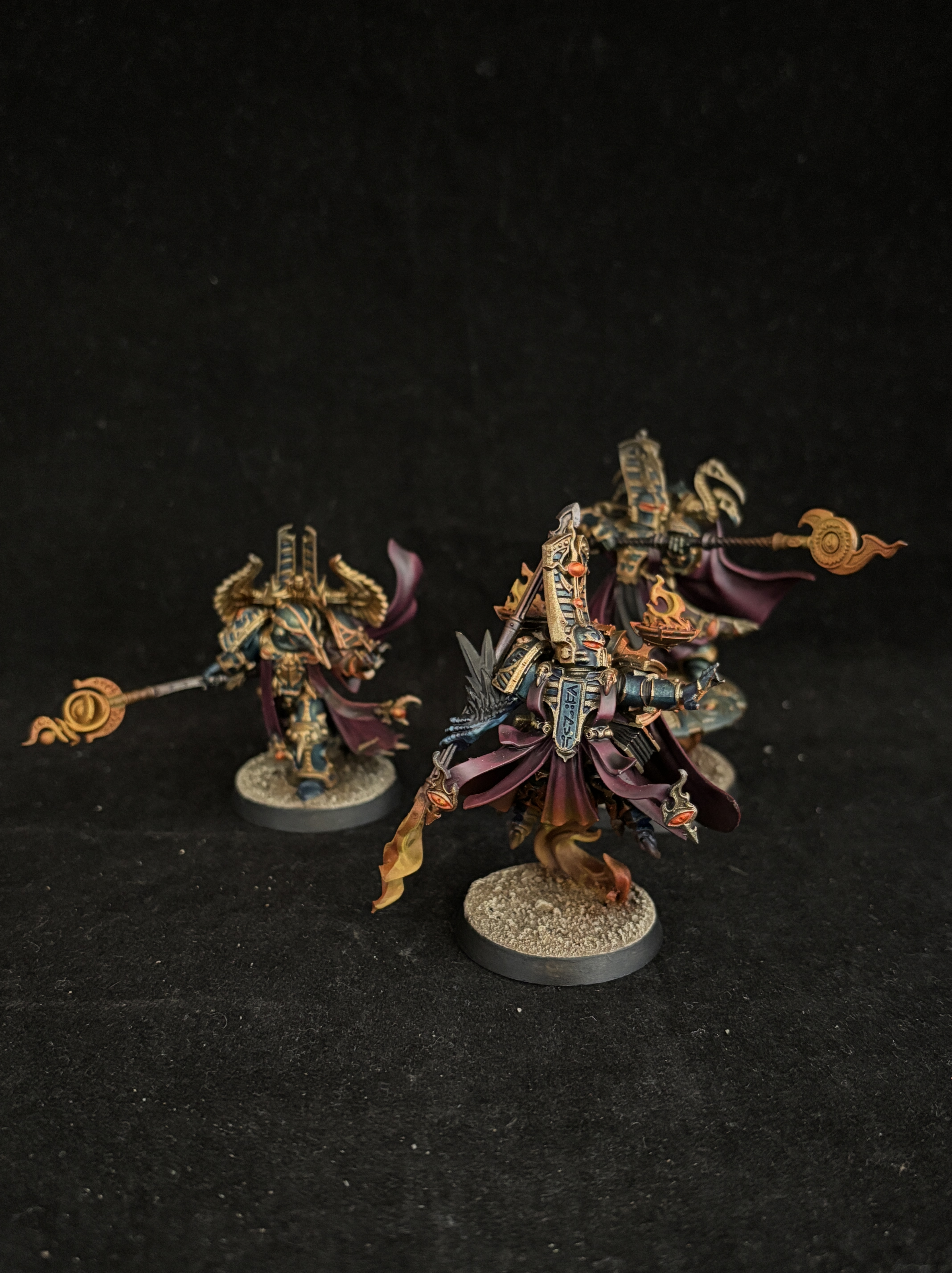 Magnus is the main centerpiece of the army, with huge wings painted with a galaxy effect, and bright orange effects that really pop against the burgundy color of the skin. This burgundy is used throughout the army for the cloaks and robes.