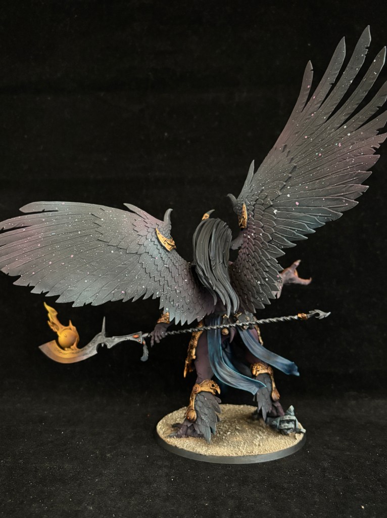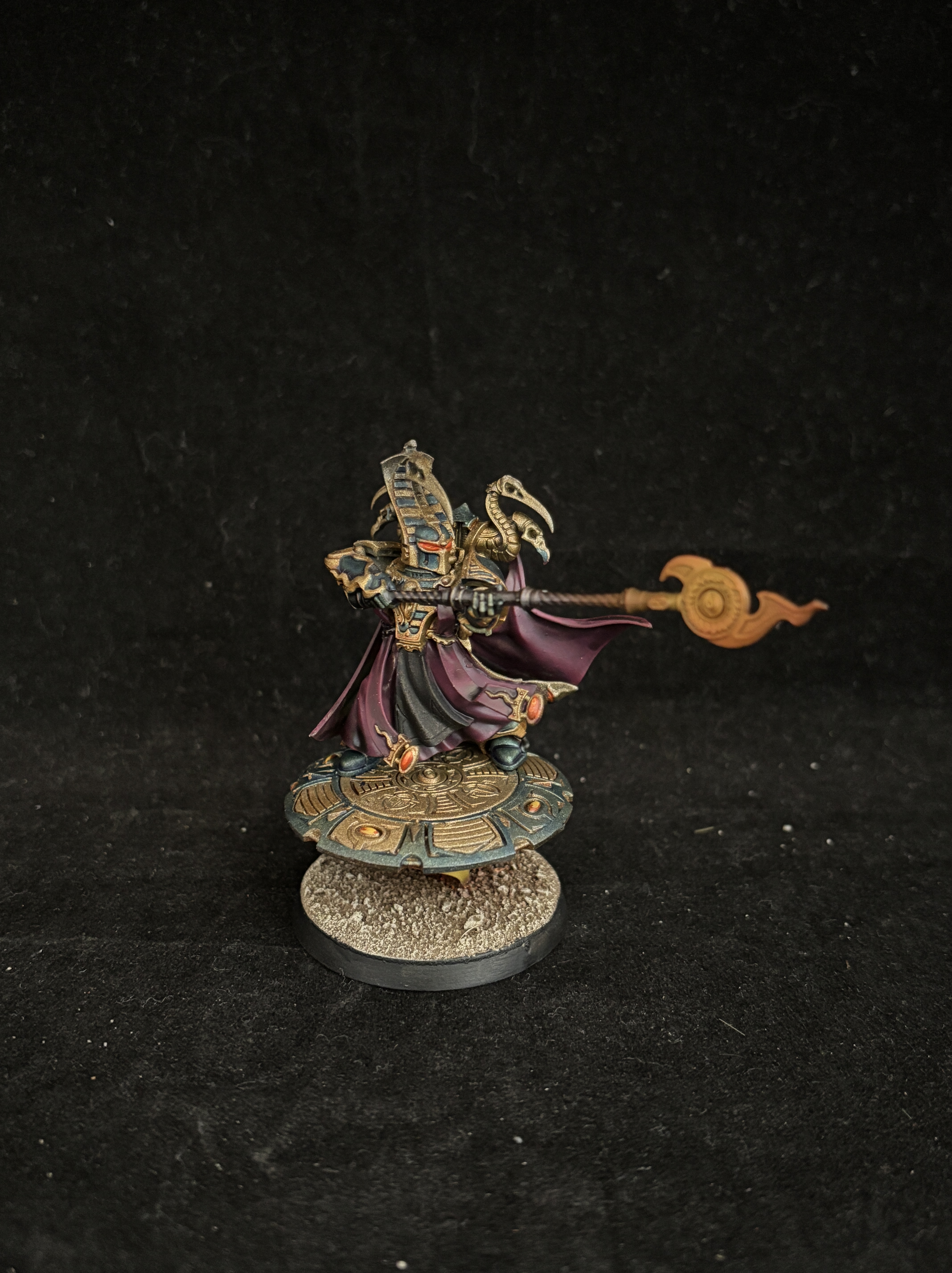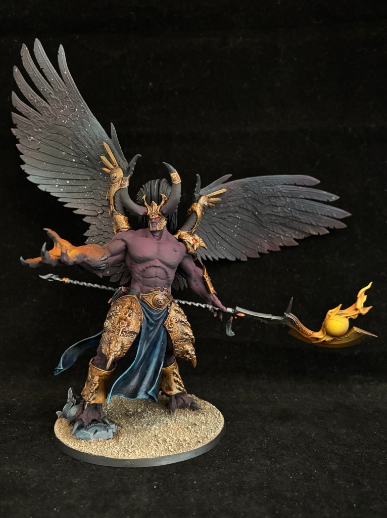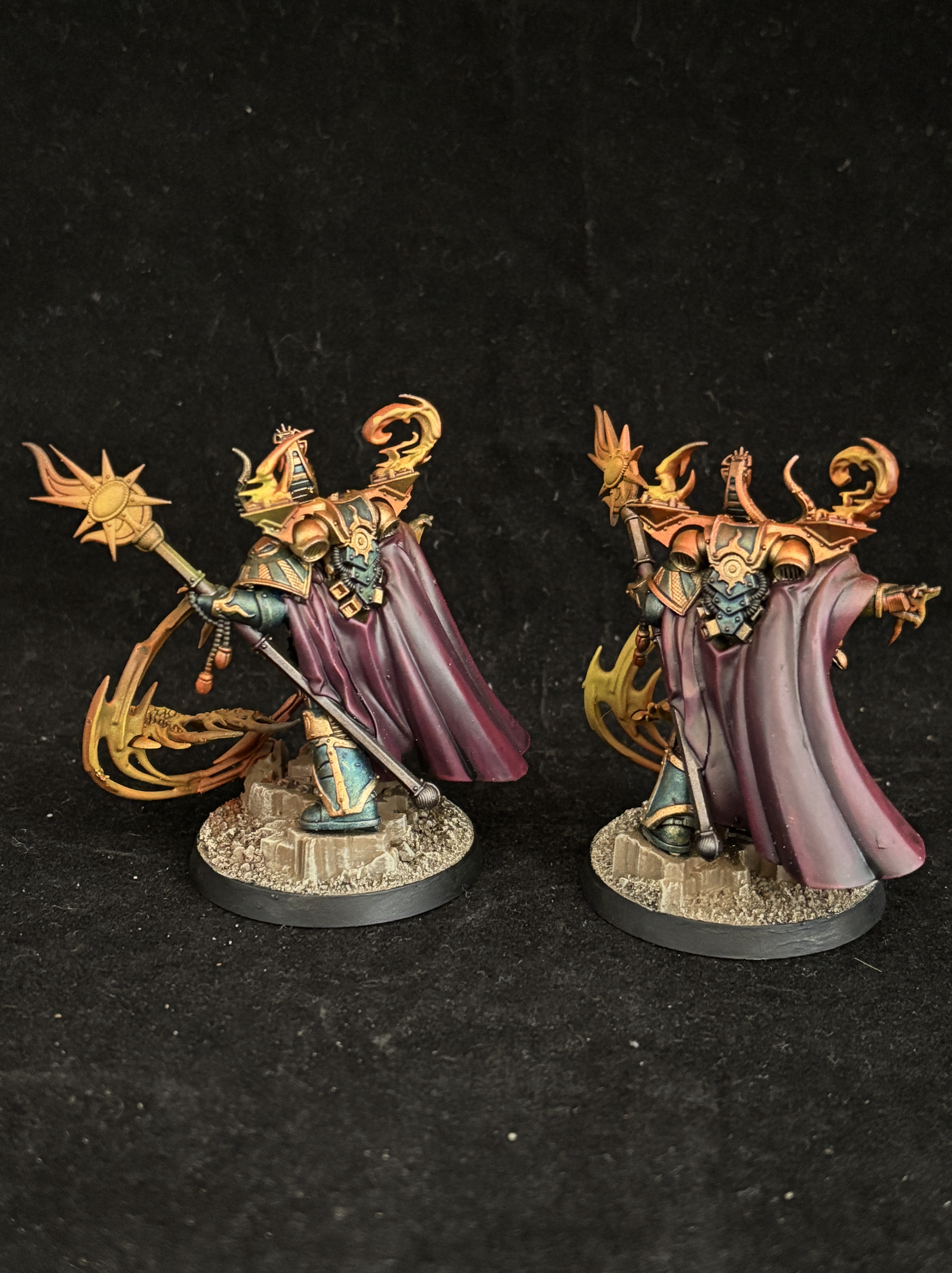Magnus is the main centerpiece of the army, with huge wings painted with a galaxy effect, and bright orange effects that really pop against the burgundy color of the skin. This burgundy is used throughout the army for the cloaks and robes.