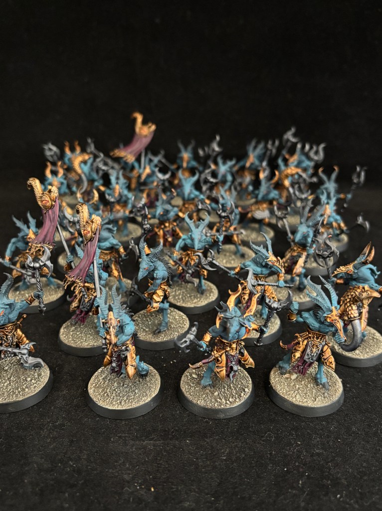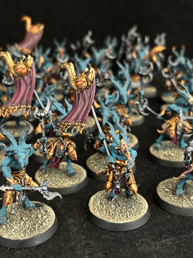 The infantry makes up the core of the force. They are all painted to keep the same clean, unified Thousand Sons look. The Tzaangors are different because they would look wacky in metallic, but by keeping all the other colors the same as our Thousand Sons, they still fit in nicely.