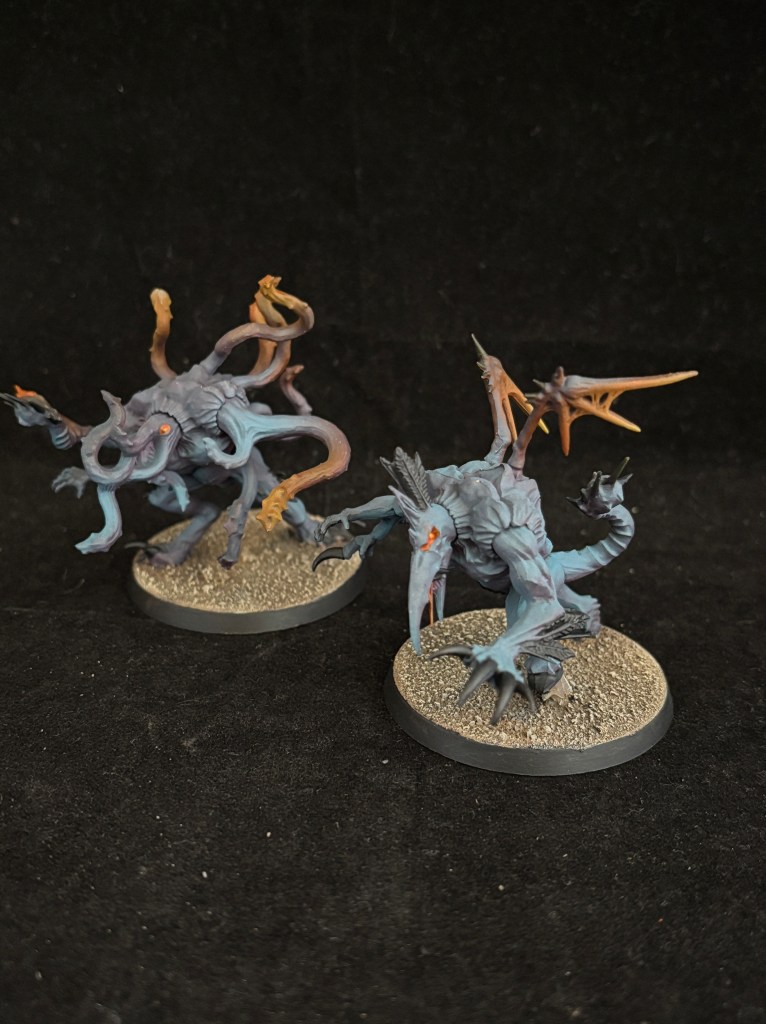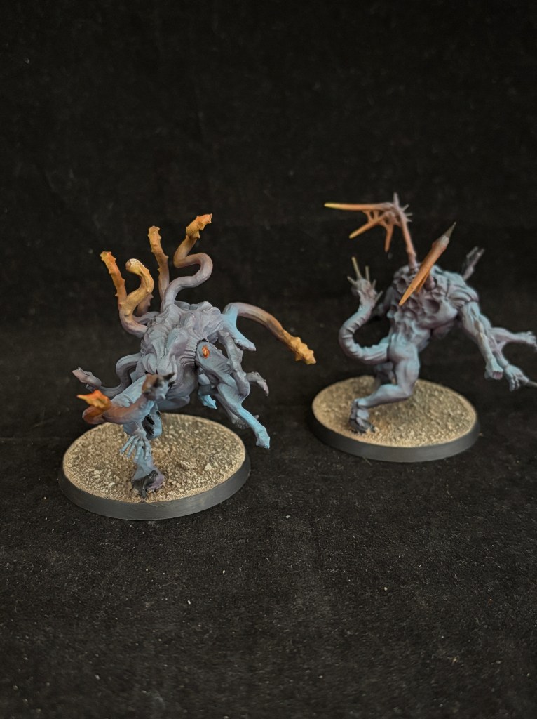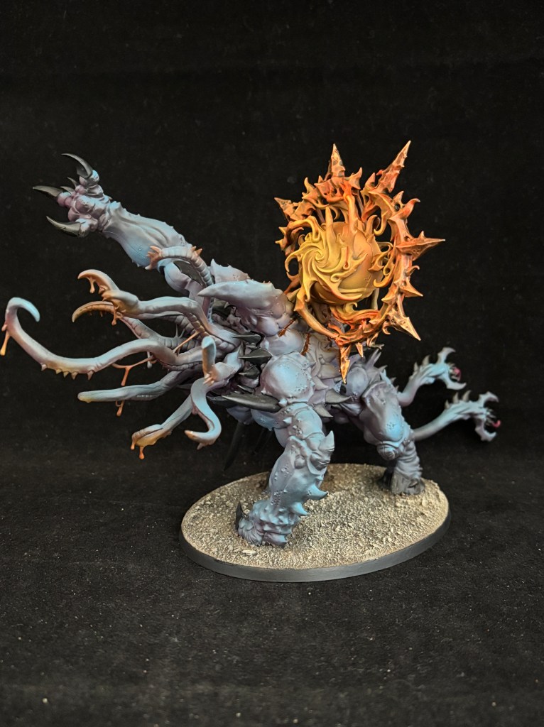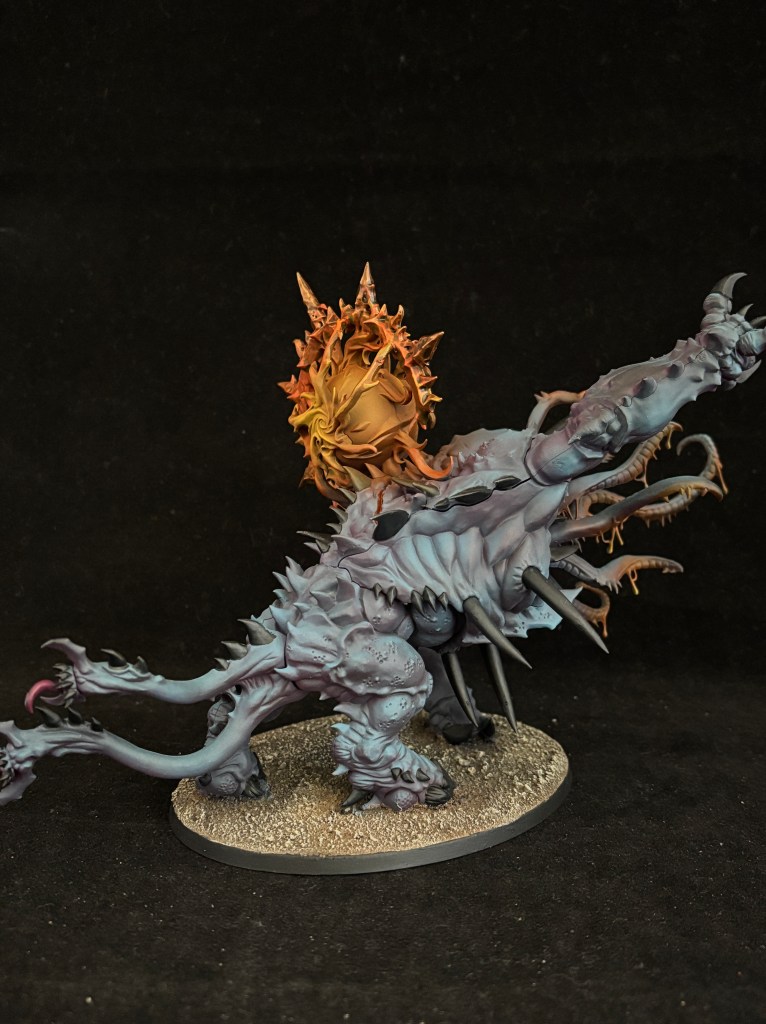 The Mutalith Vortex Beast and the Chaos Spawn are much like the Tzaangors, where they have a very unique look, but share all the colors used across the army to still fit in. The bases and the glow help in that regard. The Vortex Beast was quite fun to paint and the skin color started with a step called “Well this thing I just thought of should work right?”