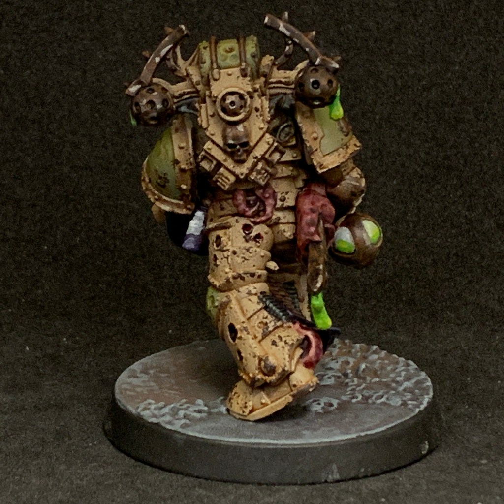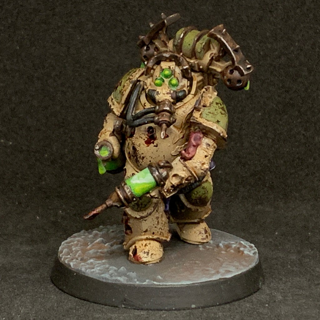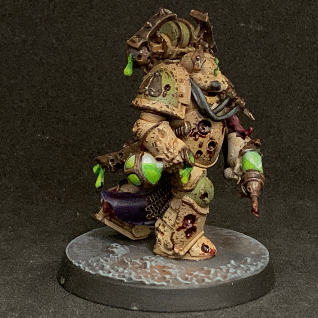 This one is painted in Horus Heresy Death Guard Colors. I changed the backpack to a more classic one. This keeps some of the Horus Heresy feel, while still having plenty of stains and mutations, and chunkier 40K style. Also heavy weathering, for good measure.