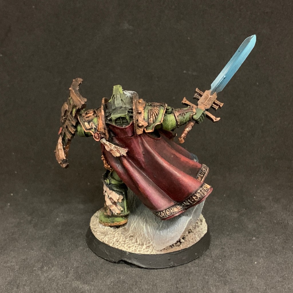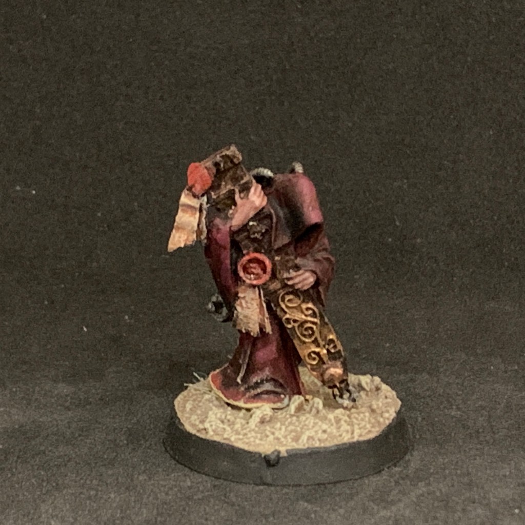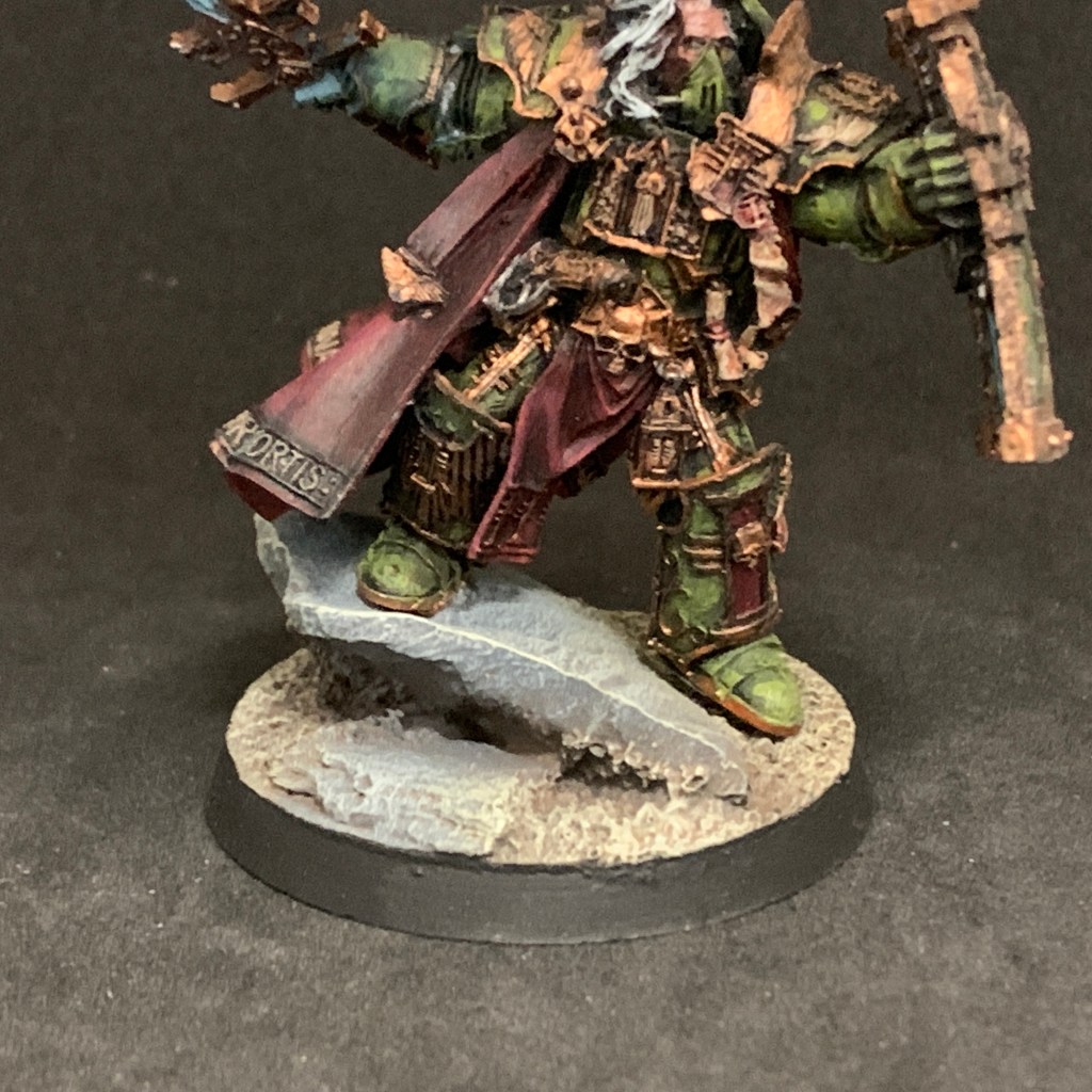 I liked the green armor and dark gold trim, all that was needed was some touching up and some extra contrast on them. I also redid the sword for something that would pop, and changed the base to have something I could replicate on, say, a pile of Kriegsmen, in the future.