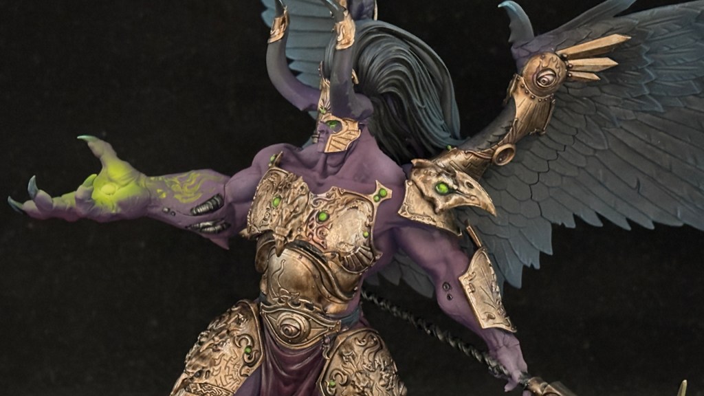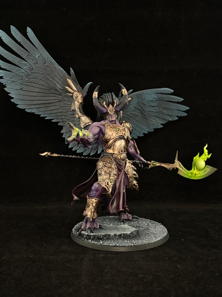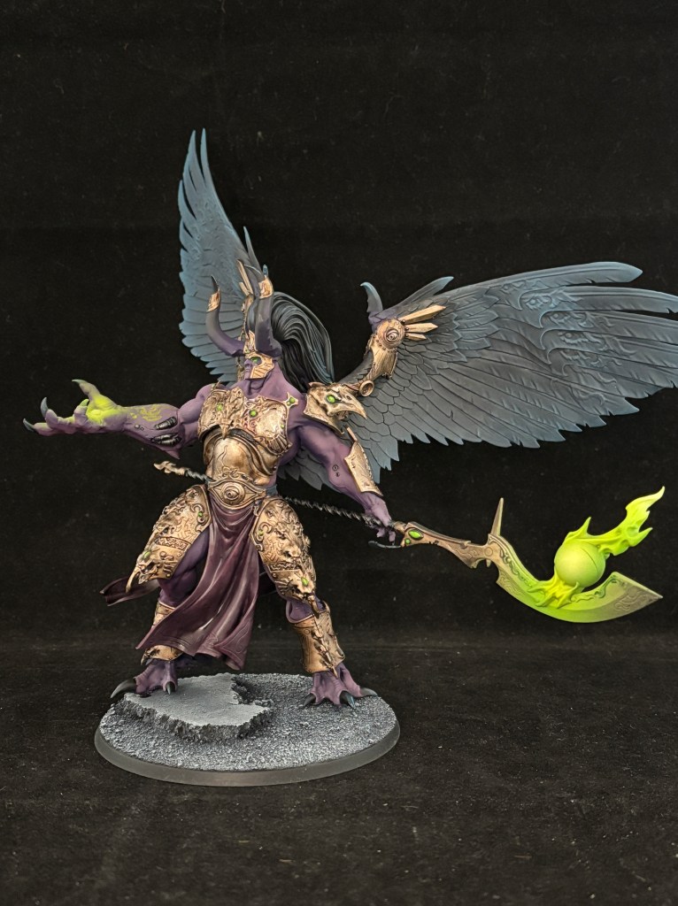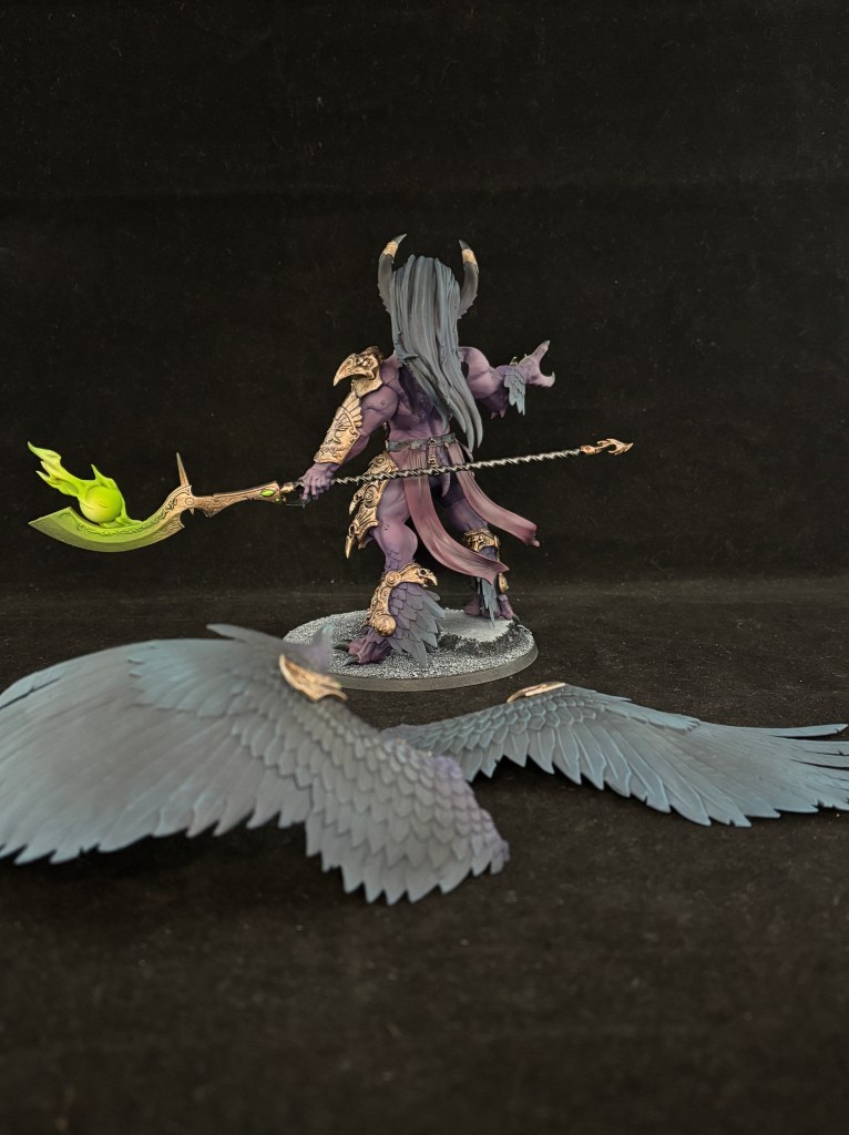 As for color choices, this is a more brooding take than the classique Games Workshop box art. I was aiming for dark pink skin, which turned out to be more purple than I anticipated. I kept every color dark on the miniature, like dark feathers and tarnished gold in order to make the magical bits stand out more. It’s also why I did not do the runes on the wings a different color. Less is more when it comes to eye popping colors.
