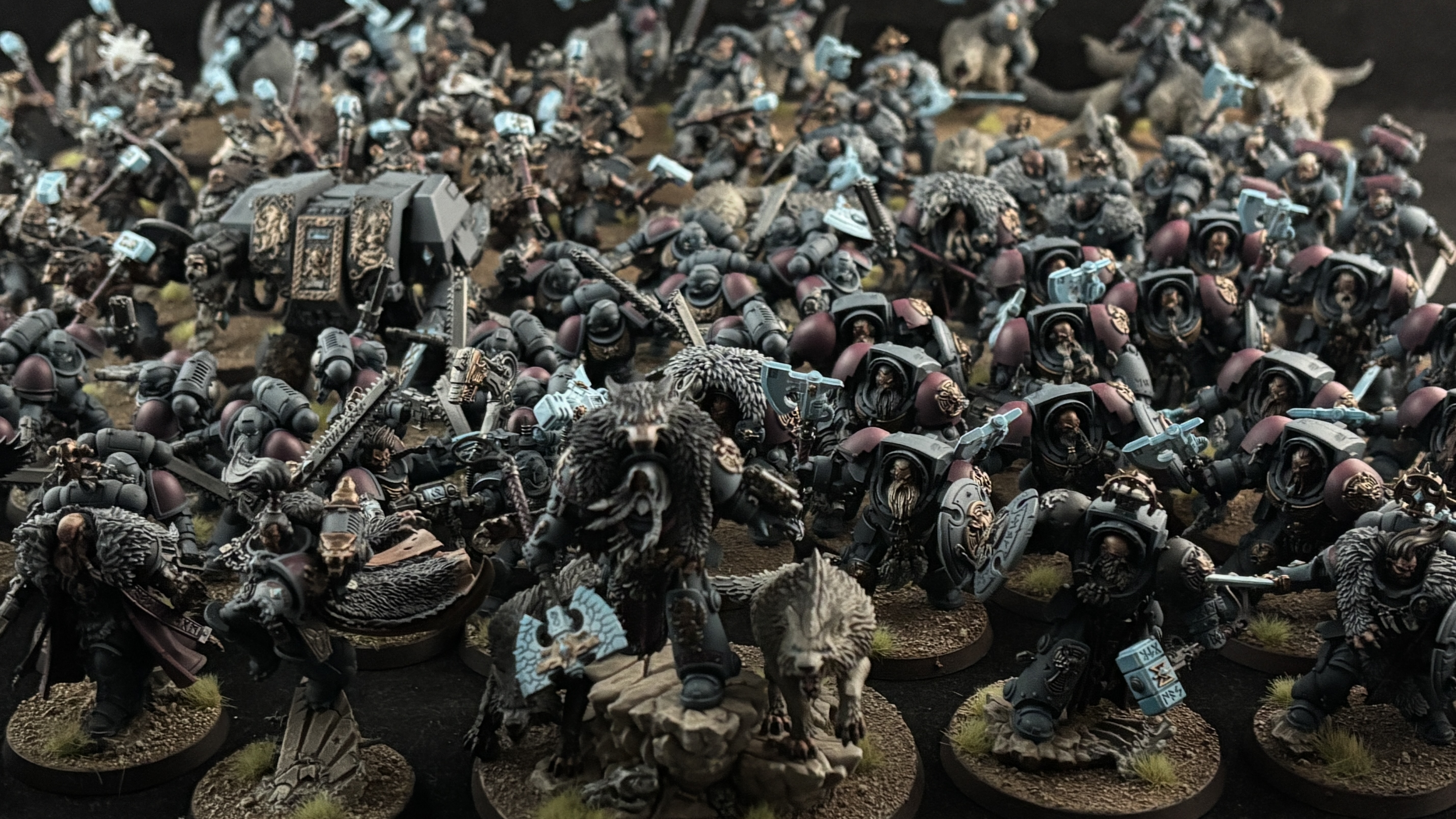 A Space Wolves army built entirely from unique chapter units, featuring Wulfen, Thunderwolf Cavalry, and Wolf Guard variants, painted in a dark grey scheme.